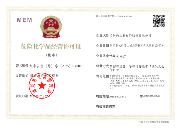 紹興興欣新材料股份有限公司成立于2002年06月27日,占地面積122畝,位于杭州灣上虞經(jīng)濟(jì)技術(shù)開發(fā)區(qū)拓展路2號(hào),現(xiàn)有職工200余人,專業(yè)技術(shù)人員50余人;博士、碩士研究生30余人組成的一支知識(shí)型、專業(yè)化的技術(shù)科研團(tuán)隊(duì)。公司面向全球市場(chǎng),專業(yè)開發(fā)電子化學(xué)品、環(huán)保化學(xué)品、醫(yī)藥中間體、高分子材料等先進(jìn)新材料重點(diǎn)領(lǐng)域的省級(jí)科技型企業(yè);建有浙江上虞、安徽東至兩個(gè)生產(chǎn)基地。目前為“國(guó)家高新技術(shù)企業(yè)”、浙江省“隱形冠軍”企業(yè)、浙江省專精特新中小企業(yè);建有“省級(jí)”研究開發(fā)中心,共建天津大學(xué)浙江紹興研究院電子化學(xué)品研發(fā)中心。